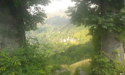 From Alpe Res the path leads downwards again and then on tarmac to Santa Maria. It is a not too long, but awful stretch, especially in this heat. We took a break at Santa Maria and had a drink at the posto tappa. I am so glad I didn't go there yesterday as I had originally planned. It is squallid, at least what I saw. The path wasn't as nice as the one yesterday, but nice and there were some nice views of the alps and small villages, like the place in the photo (I have no idea what it is called).